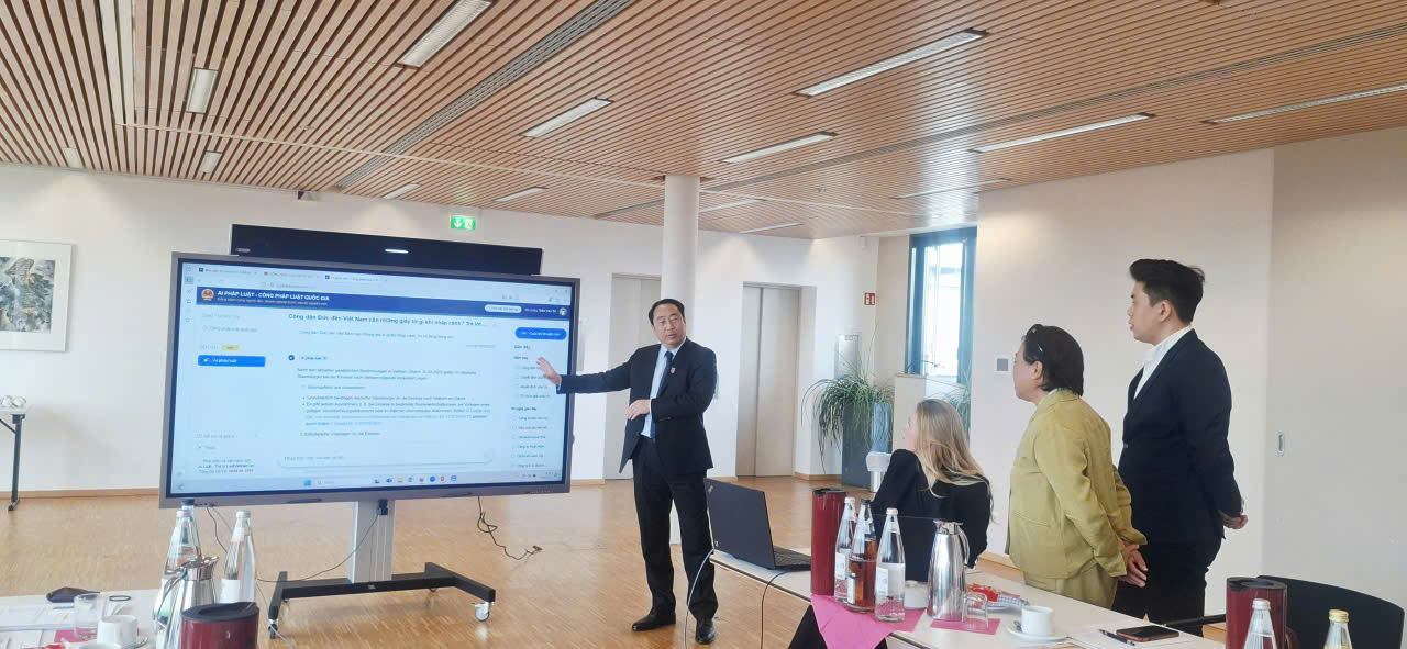 Bên cạnh đó, Đoàn công tác cũng được nghe một đại diện khác của Liên  đoàn luật sư liên bang Đức - bà Nadja Wietoska chia sẻ về hoạt động ứng dụng công nghệ thông tin trong quản trị các công ty, văn phòng  luật sư tại Đức như: hệ thống phần mềm quản lý nội bộ của các văn phòng luật sư, hệ thống hộp thư điện tử đặc biệt của luật sư (beA), hệ thống lưu trữ dữ liệu đám mây và ứng dụng trí tuệ nhân tạo (AI). Các hệ thống này cũng góp phần giảm thiểu các hồ sơ, giấy tờ cho người dân khi muốn luật sư hỗ trợ. Cũng tại buổi làm việc, ông Lê Vệ Quốc, Cục trưởng Cục Phổ biến, giáo dục pháp luật và Trợ giúp pháp lý, Trưởng đoàn đã giới thiệu với phía bạn về mô hình trợ giúp pháp lý ở Việt Nam và AI pháp luật trên Cổng pháp luật quốc gia.