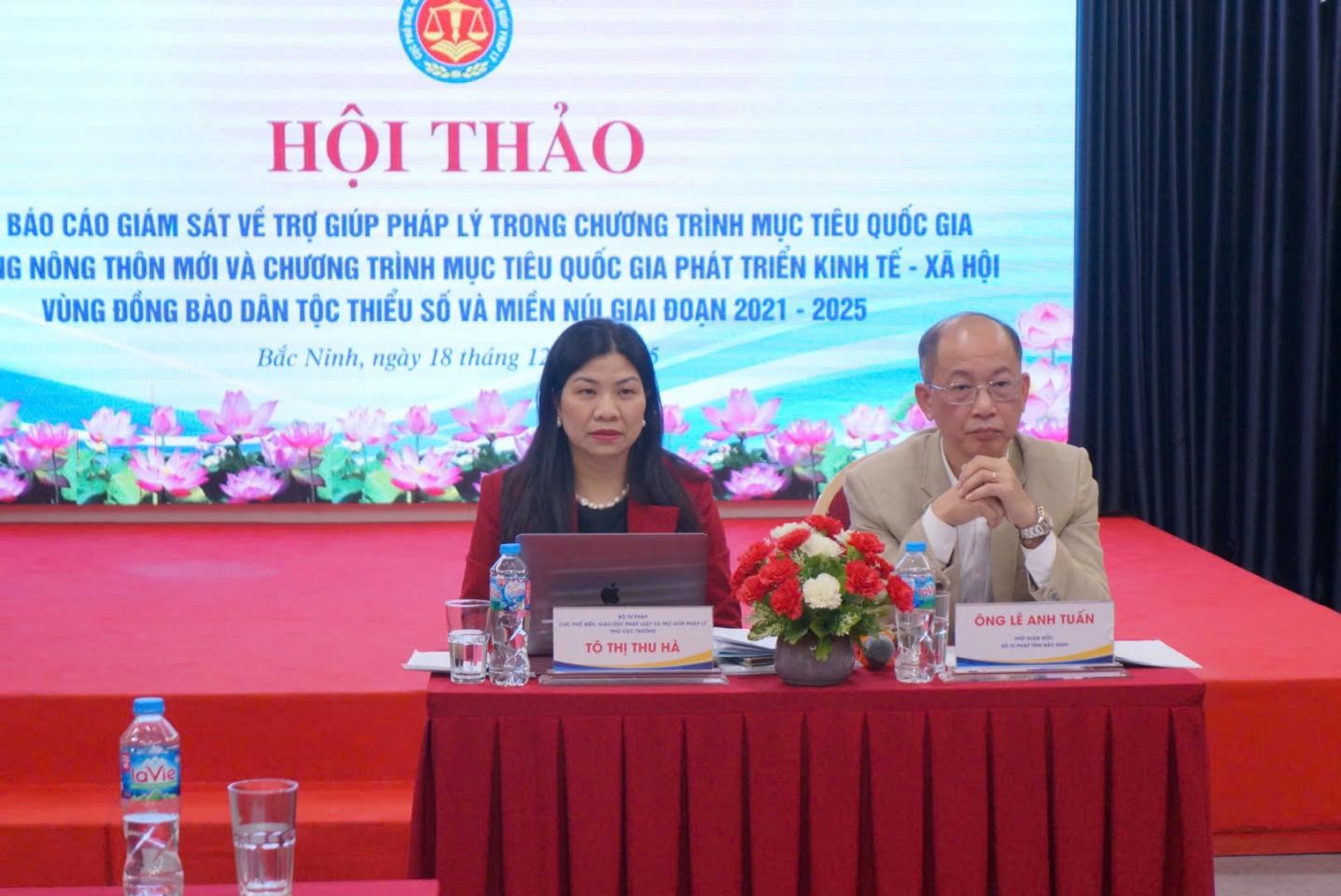 Ngày 18/12/2025, tại tỉnh Bắc Ninh, Cục Phổ biến, giáo dục pháp luật và Trợ giúp pháp lý, Bộ Tư pháp đã tổ chức Hội thảo góp ý báo cáo giám sát việc thực hiện nội dung trợ giúp pháp lý trong Chương trình mục tiêu quốc gia xây dựng nông thôn mới và Chương trình mục tiêu quốc gia phát triển kinh tế - xã hội vùng đồng bào dân tộc thiểu số và miền núi giai đoạn 2021 – 2025.