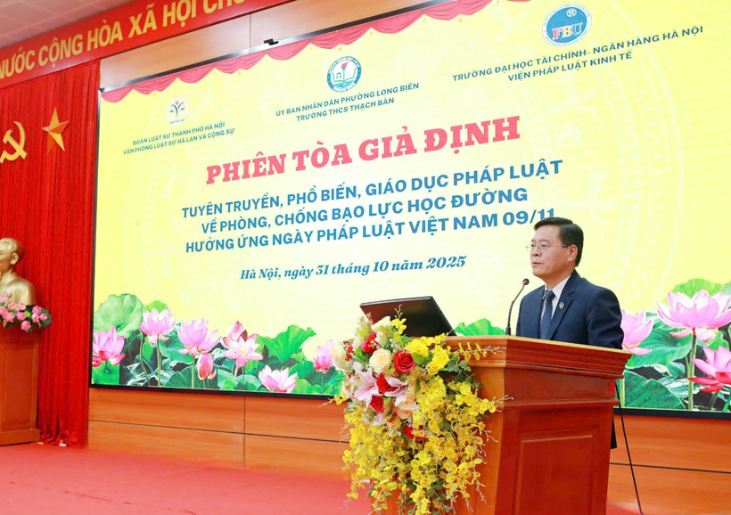 Văn phòng Luật sư Hà Lan và Cộng sự - Đoàn Luật sư TP. Hà Nội phối hợp với Viện Pháp luật Kinh tế- Trường Đại học tài chính Ngân hàng Hà Nội tuyên truyền pháp luật về bạo lực học đường dưới hình thức phiên tòa giả định tại Trường THCS Thạch Bàn, phường Long Biên, TP. Hà Nội ngày 31/10/2025.