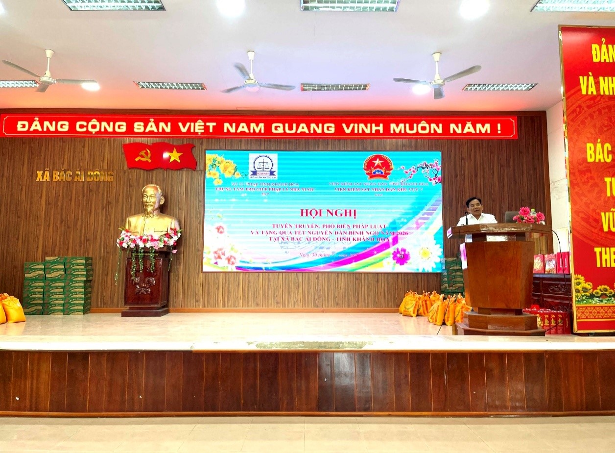 Hòa chung trong không khí phấn khởi, thi đua sôi nổi chào mừng thành công Đại hội đại biểu toàn quốc lần thứ XIV của Đảng, hướng tới thực hiện thắng lợi các mục tiêu, nhiệm vụ phát triển kinh tế - xã hội và bảo đảm an sinh xã hội trên địa bàn tỉnh Khánh Hòa; vào ngày 30/01/2026, Trung tâm trợ giúp pháp lý nhà nước tỉnh Khánh Hòa đã phối hợp với Viện kiểm sát nhân dân khu vực 7 - Khánh Hòa tổ chức Hội nghị tuyên truyền, phổ biến pháp luật kết hợp tặng quà Tết Nguyên đán Bính Ngọ năm 2026 cho người dân trên địa bàn xã Bác Ái Đông.