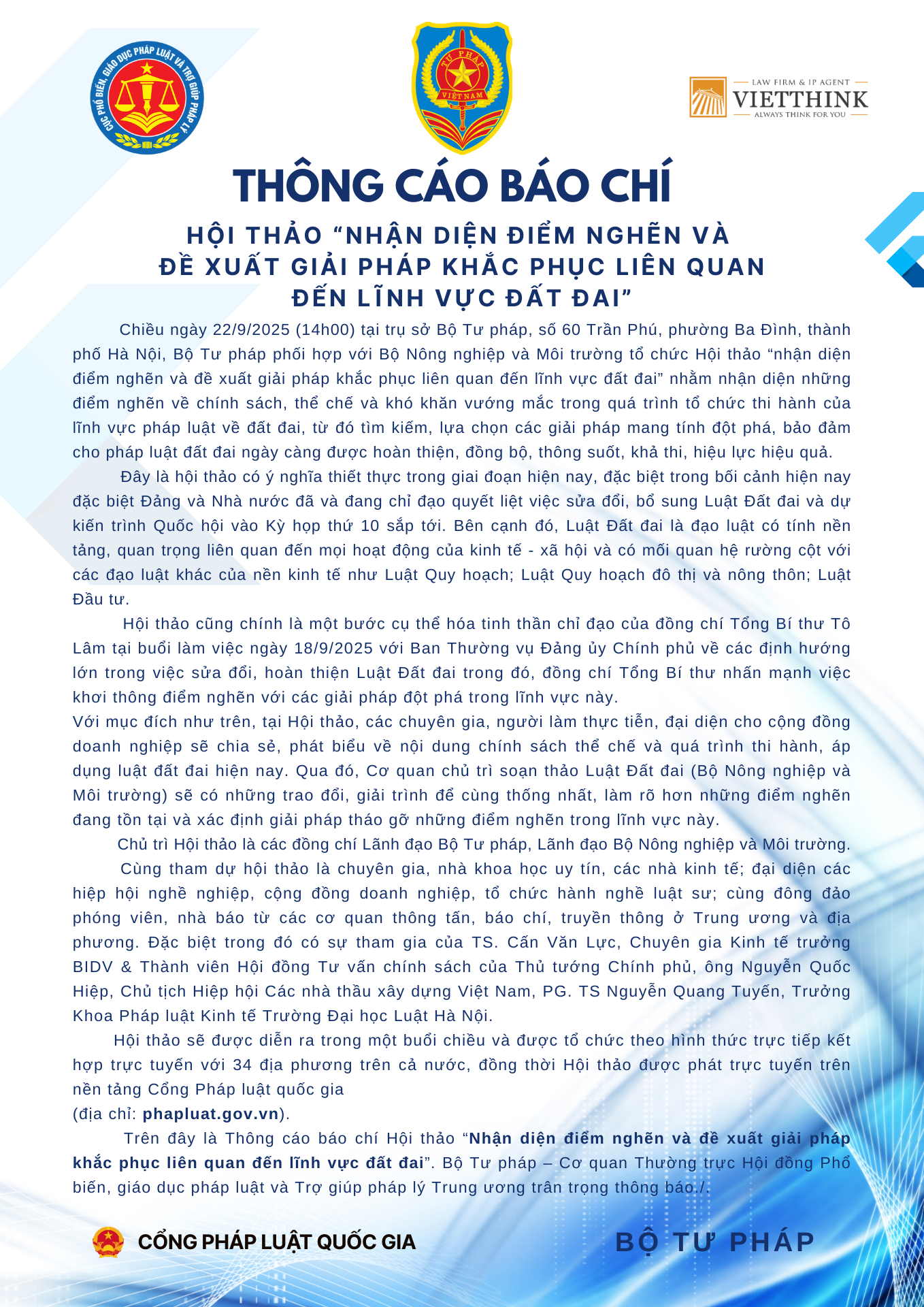 THÔNG CÁO BÁO CHÍ HỘI THẢO NHẬN DIỆN "ĐIỂM NGHẼN" VÀ ĐỀ XUẤT GIẢI PHÁP KHẮC PHỤC LIÊN QUAN ĐẾN LUẬT ĐẤT ĐAI